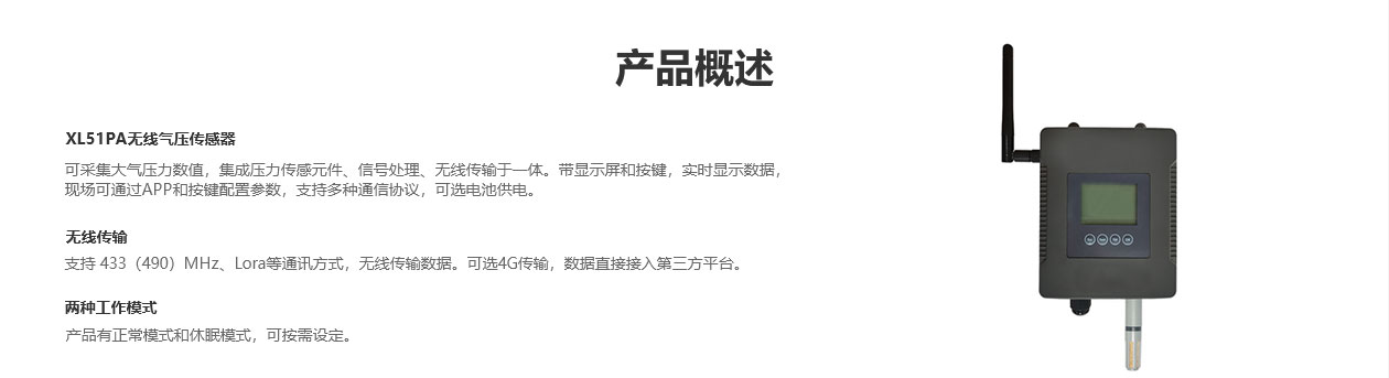 XL51PA無線氣壓傳感器,可采集大氣壓力數(shù)值,集成壓力傳感元件、信號處理、無線傳輸于一體。帶顯示屏和按鍵,實(shí)時顯示數(shù)據(jù),現(xiàn)場可通過APP和按鍵配置參數(shù),支持多種通信協(xié)議。