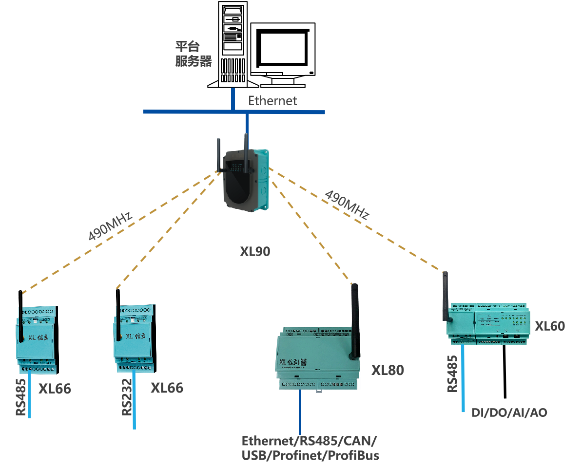 類似泵房、水廠、水源井等場所的數(shù)據(jù)監(jiān)測,監(jiān)測點的數(shù)據(jù)先上傳至XL90物聯(lián)網(wǎng)關(guān),再通過NB/GPRS/LTE轉(zhuǎn)發(fā)數(shù)據(jù)至云平臺,此種情況,數(shù)以后在量大時,可選LTE(4g)方式