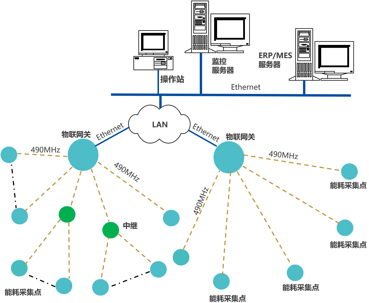 采集節點智能裝置,通過LoRa上傳能耗數據至物聯網關,網關通過Ethernet或Wi-Fi,接入企業內部LAN,推送數據至企業能源管理系統,及MES等和其它系統;