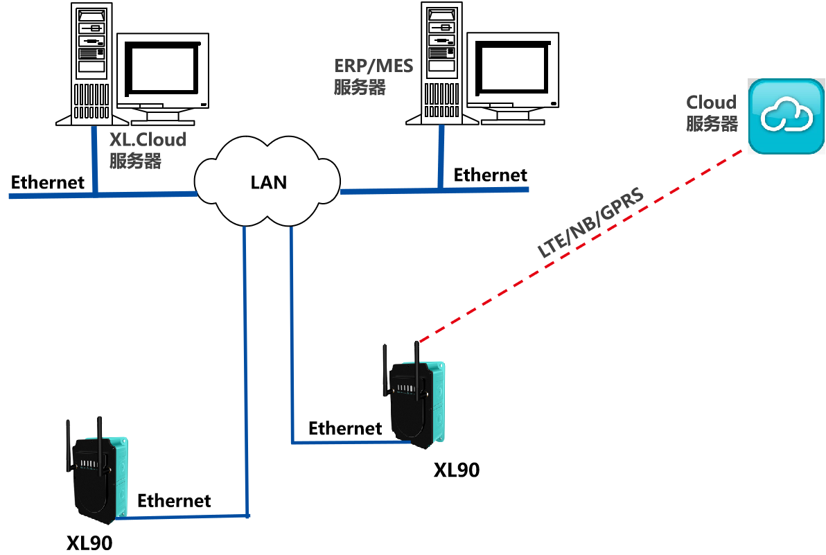 如下圖所示,XL90,將數據上傳給企業內部的多個系統軟件平臺;通過LTE(4g)/NB/GPRS將數據上傳至云服務器;