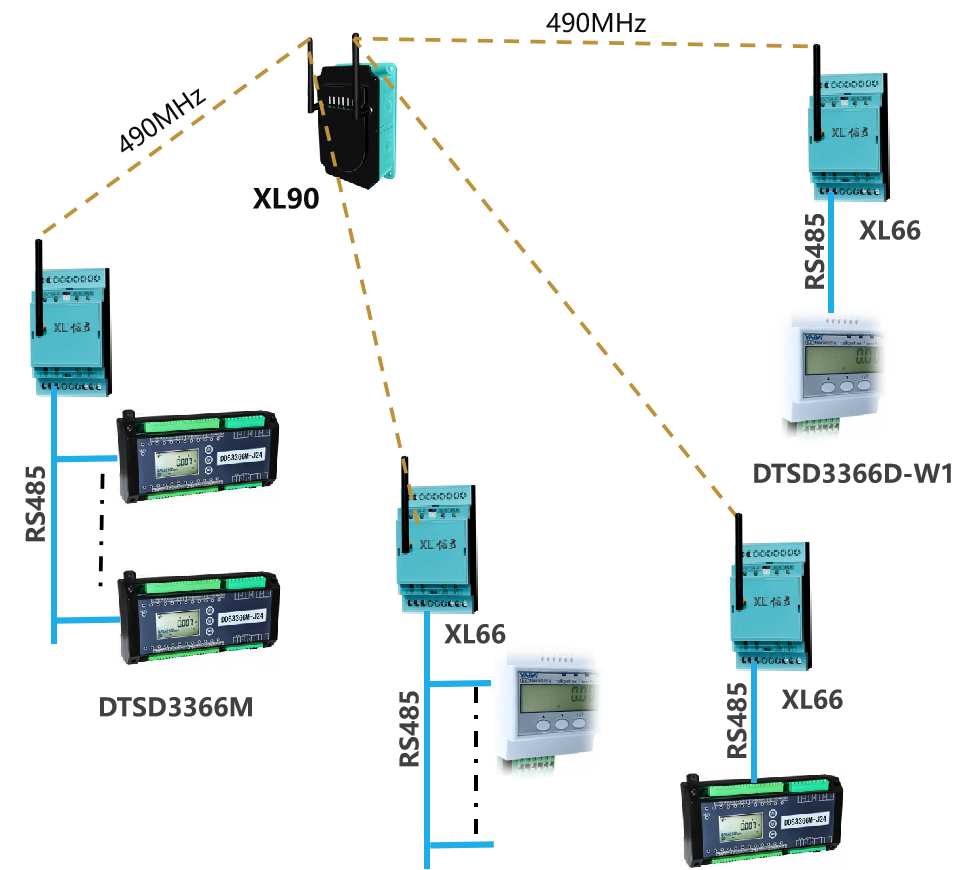 每個監測點,配置1臺XL66智能轉換器,從RS485/232接口,讀取電能表的數據,無線方式上傳至XL90物聯網關;