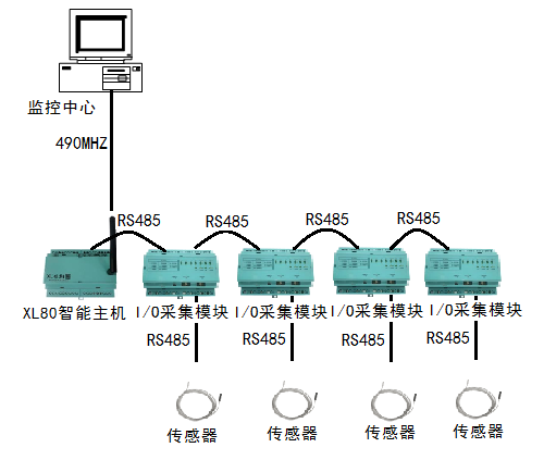 選擇我司XL80智能主機,作為系統的通信中樞。智能主機通過RS485方式采集我司的I/O模塊XLDX及XLAI的數據信息。智能主機對采集的數據進行協議轉換、處理、保存,通過無線的方式,推送數據至中控室監控中心;