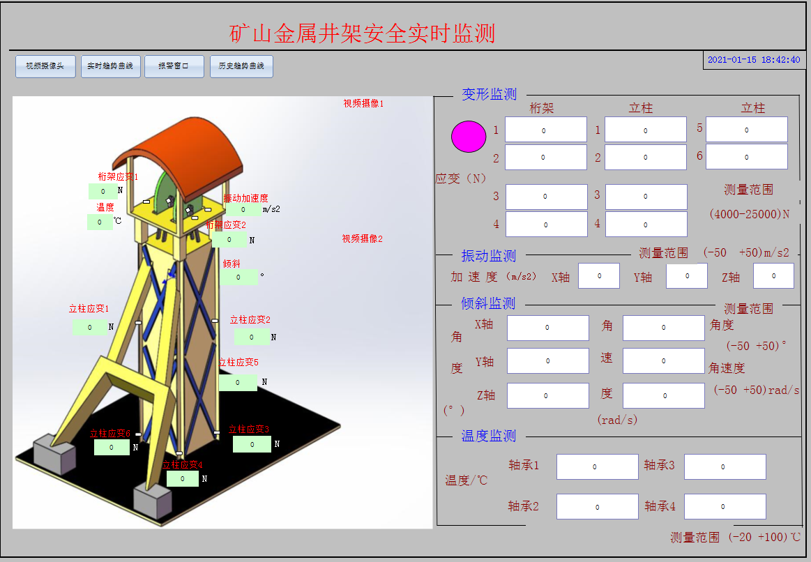 基于XIoT技術的煤礦井架安全實時監測系統,實時監測井架環境參數。當參數異常或出現險情時,中控室發出報警聲提醒工作人員。 1)需提供攝像頭實時監測井架周邊情況 ; 2)實時監測井架受力情況、振動情況、傾斜情況及軸承溫度情況; 3)PC界面可實時查看數據信息,數據存儲不少于180天。