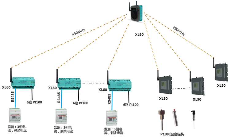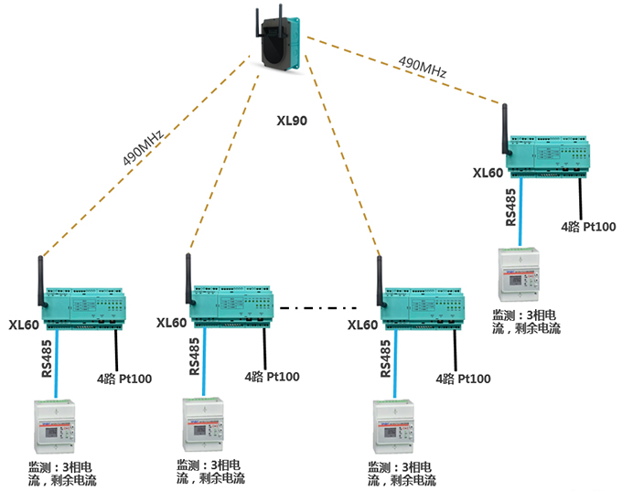 配置1臺(tái)XL60智能采集裝置,通過AI模塊采集4只溫度探頭信號(hào),通過RS485讀取電氣監(jiān)測(cè)儀表數(shù)據(jù);XL60通過無(wú)線上傳采集的電氣、溫度數(shù)據(jù)至XL90物聯(lián)網(wǎng)關(guān)