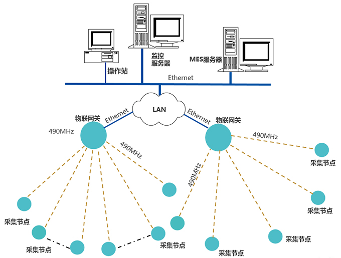 采集節(jié)點(diǎn),通過490MHz無(wú)線上傳數(shù)據(jù)至物聯(lián)網(wǎng)關(guān),網(wǎng)關(guān)通過Ethernet,接入LAN,推送數(shù)據(jù)至MES服務(wù)器