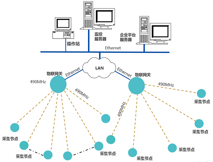 采集節(jié)點(diǎn),通過490MHz無線上傳數(shù)據(jù)至物聯(lián)網(wǎng)關(guān),網(wǎng)關(guān)通過Ethernet,接入LAN,推送數(shù)據(jù)至企業(yè)管理平臺(tái)服務(wù)器