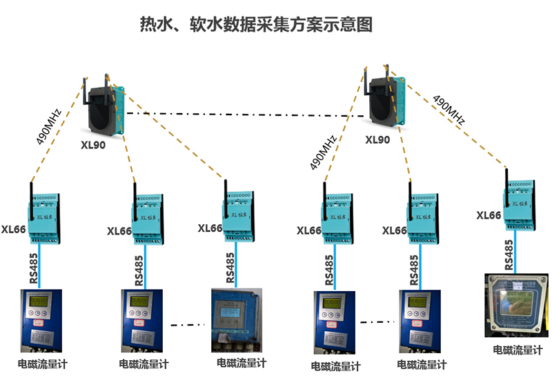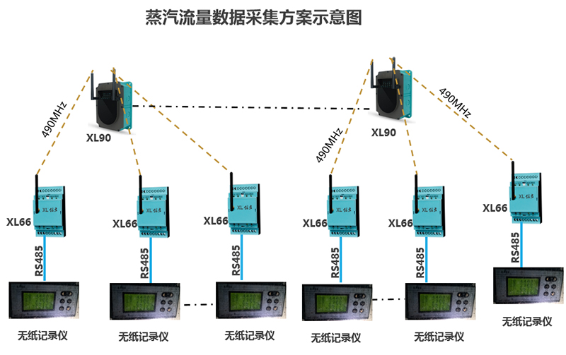 每個(gè)監(jiān)測(cè)點(diǎn)配置1臺(tái)XL66智能轉(zhuǎn)換器,從無線記錄儀讀取蒸汽流量數(shù)據(jù),上傳至XL90物聯(lián)網(wǎng)關(guān)