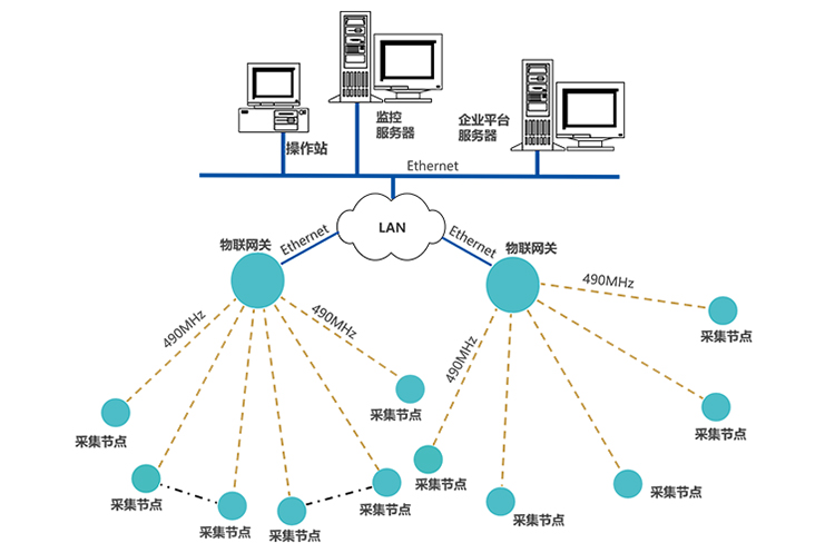 采集節點通過490MHz無線上傳數據至物聯網關,網關通過Ethernet接入LAN,推送數據至企業管理平臺服務器;