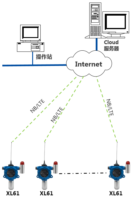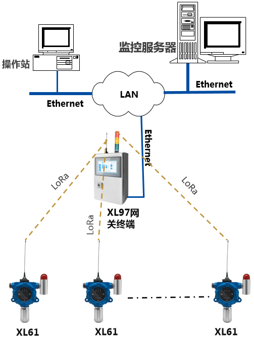 4、如增加現場集中監控點,可配置XL97網關終端,讀取區域內XL61上傳的數據,分析處理、顯示、報警,并轉發至監控中心服務器。