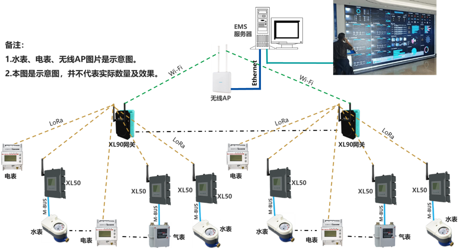 物聯(lián)網(wǎng)關(guān)通過LoRa無線讀取水、電、氣等表計的數(shù)據(jù),通過Wi-Fi推送數(shù)據(jù)至EMS(能源管理)服務(wù)器,無線AP起到橋梁作用。無線AP通過以太網(wǎng)接口,直接聯(lián)接EMS服務(wù)器。