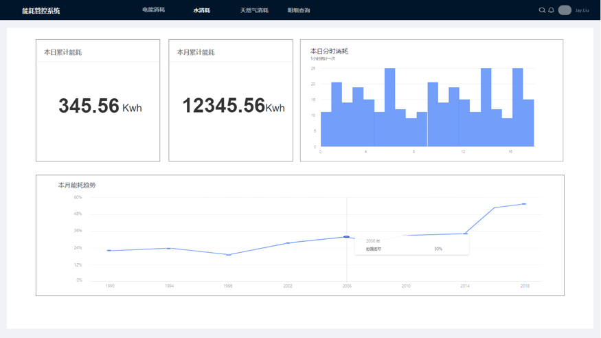 能源數(shù)據(jù)服務(wù)器,聯(lián)接到展示廳能耗看板,在大屏上更直觀的顯示能耗數(shù)據(jù),如本日累計消耗,本月累計消耗,柱狀圖用來顯示本日每一小時的消耗量,曲線圖顯示本月每天能耗變化的情況。效果示意圖如下: