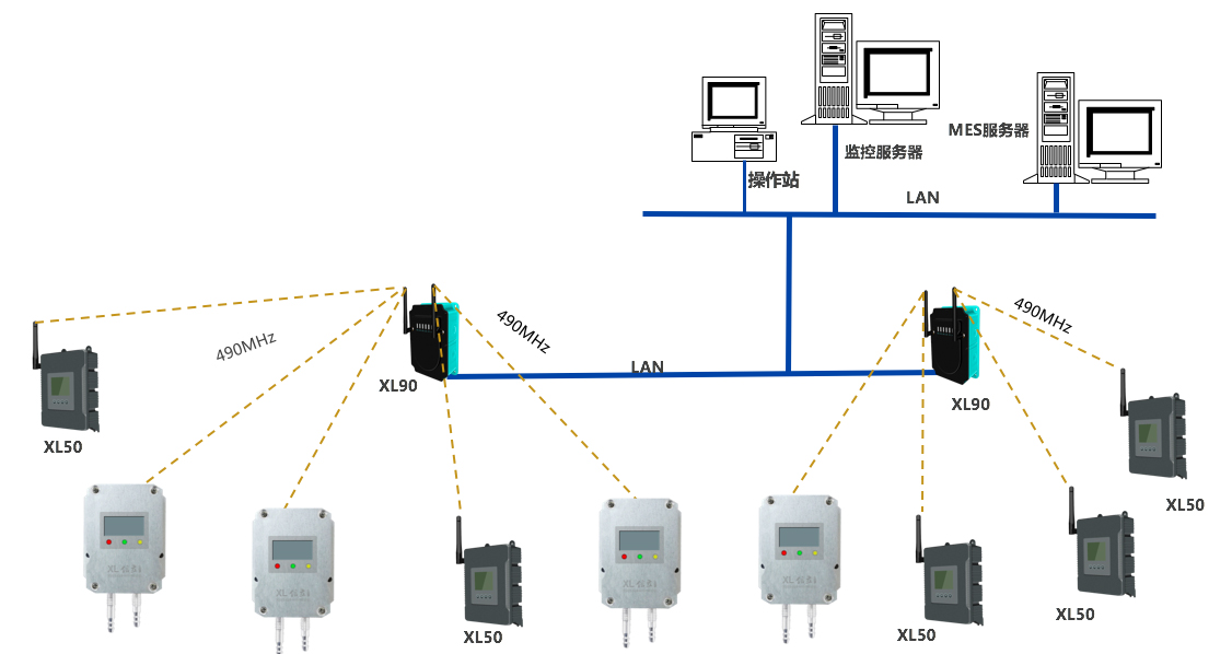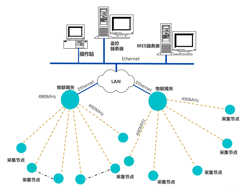 采集節點,通過490MHz無線上傳數據至物聯網關,網關通過Ethernet,接入LAN,推送數據至MES服務器;