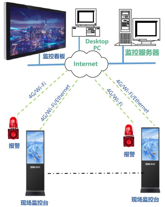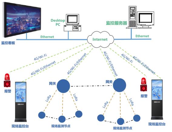 根據工地情況,選Ethernet、Wi-Fi、4G等多種方式結合的通信方案,實現平臺監控服務器和網關、看板、現場監控臺、聲光報警器、移動終端等設備的通信。