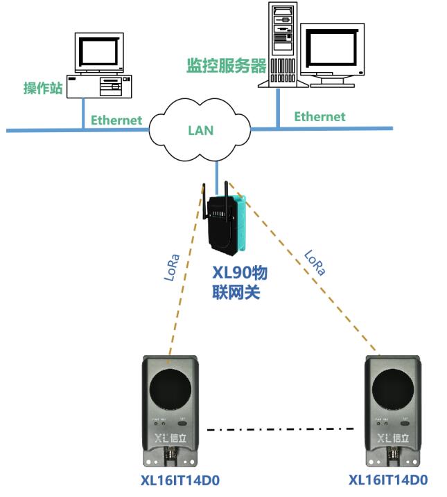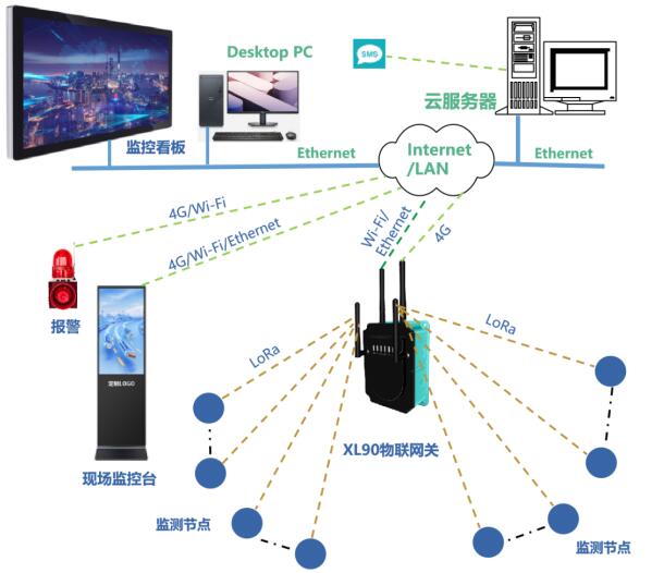 LoRa無線上傳溫度數據,須選XL9X系列物聯網關作無線接收端,通過Ethernet、Wi-Fi、RS485,或4G通信方式,接入溫度監控軟件平臺,支持Modbus RTU/TCP、MQTT、SOAP、寫數據庫等通信協議。