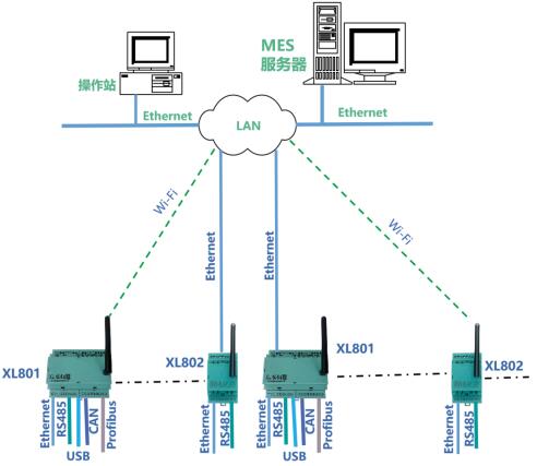 XL80通信主機,從設(shè)備通信接口,讀取設(shè)備或系統(tǒng)的運行數(shù)據(jù),通信協(xié)議轉(zhuǎn)換處理后,再通過Ethernet或Wi-Fi,接入LAN,轉(zhuǎn)發(fā)數(shù)據(jù)至MES。
