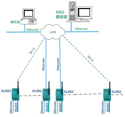 數據聯網:XL80通信主機從設備通信接口讀取設備或系統的運行數據,通信協議轉換處理后,再通過EthernetWi-Fi,接入企業LAN,轉發數據至MES或監控平臺。