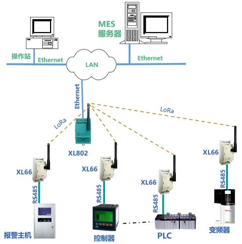 數據聯網:XL80主機通過LoRa無線傳輸技術,從XL66無線讀取設備的運行數據,通信協議轉換處理后,通過Ethernet轉發數據至MES或監控平臺。