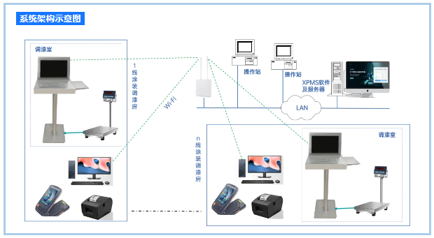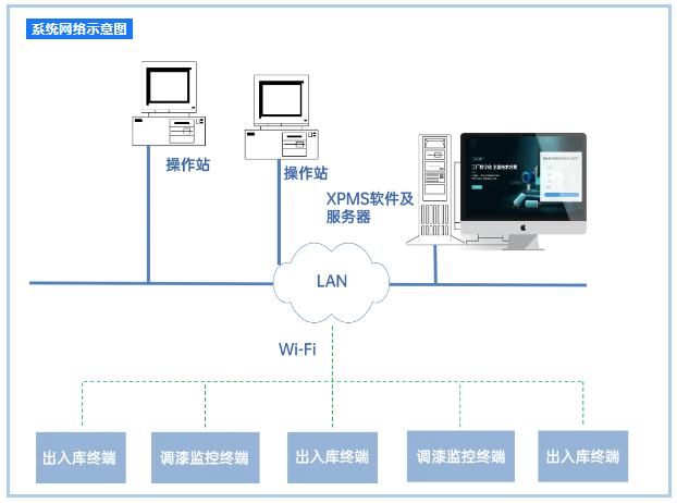 信立智能調漆系統XPMS服務器及平臺軟件調漆終端出入庫終端Wi-Fi網絡構成。