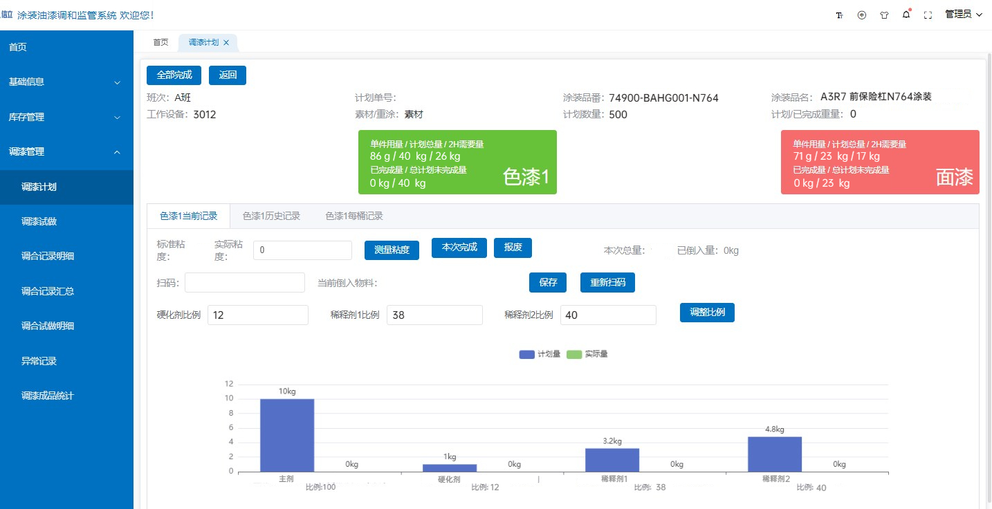 系統采用可視化直觀調漆界面設計,根據調漆計劃智能匹配調漆工藝,自動計算主劑、固化劑、稀釋劑需要的重量,以色塊的形式實時顯示已倒入的原料重量。