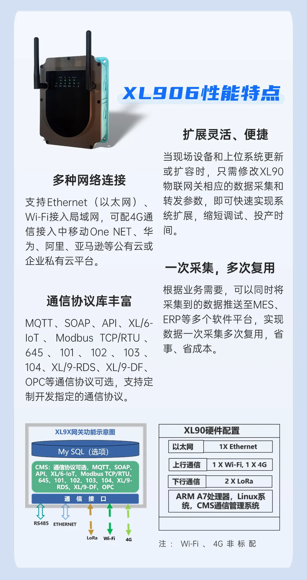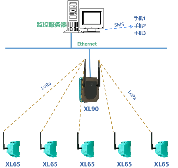 XL65通過LoRa無線上傳數據至XL90物聯網關,XL90通過Ethernet接入監控服務器或企業MES系統。