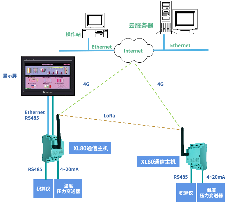 XL802通信主機,可同時將數據推送到現場顯示儀表物聯網關,實現現場就地監控平臺遠程監控