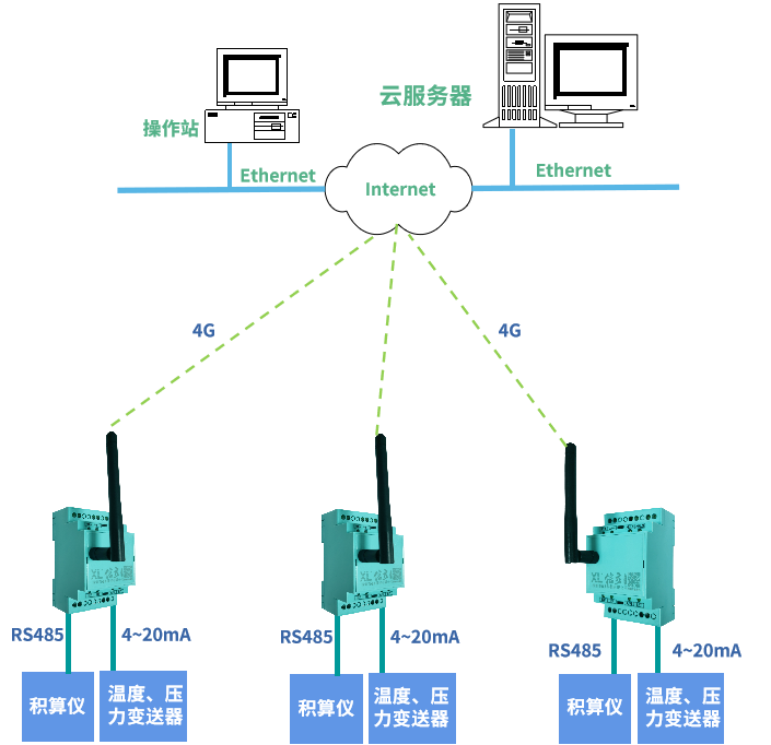 管網上已安裝的流量計、積算儀、壓力變送器、溫度變送器等儀表,由于廠家不同,通信接口可能不統一,選擇XL802通信主機,搭配XLAI模擬量輸入模塊,可同時讀取儀表4~20mARS485通信接口的信號,將管道壓力、溫度、瞬時流量、累積流量等關鍵數據,無線遠傳至監控平臺。
