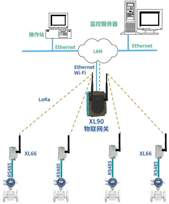構(gòu)建星型 LoRa 無線傳輸網(wǎng)絡(luò),以XL90物聯(lián)網(wǎng)關(guān)為中心節(jié)點(diǎn),多個XL6666作為終端節(jié)點(diǎn)分布在各個流量計安裝位置。XL6666 采集流量計數(shù)據(jù)后,通過 LoRa 無線傳輸數(shù)據(jù)給網(wǎng)關(guān),網(wǎng)關(guān)通過Ethernet/WiFi將數(shù)據(jù)傳輸給中控室服務(wù)器。
